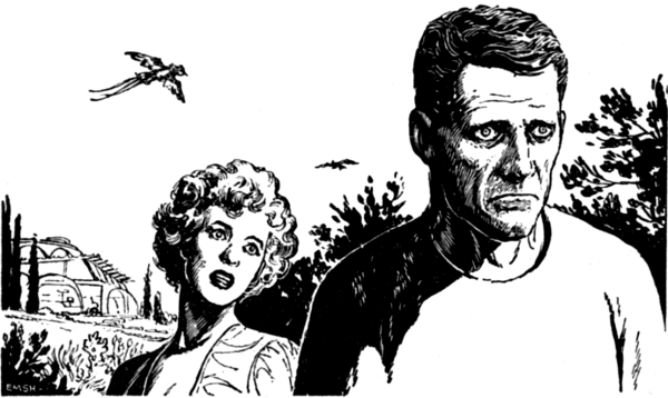 Tee Ormond sat morosely at the spaceport bar, and alternately wiped his forehead with a soggy handkerchief, and sipped at his frosted rainbow, careful not to disturb the varicolored layers of liquid in the tall narrow glass. Every now and then he nervously ran his fingers through his straight black hair, which lay damply plastered to his head. His jacket was faded and worn, and above the left pocket was emblazoned the meteor insignia of the spaceman. A dark patch on his back showed where the perspiration had seeped through. He blinked and rubbed the corner of his eye as a drop of perspiration ran down and settled there.