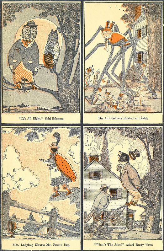 Furthermore, in the daytime Kiddie and his fellows were as quiet as they could be. Having waked the echoes all night long,[7] they were content, when morning came, to rest silently among the trees and shrubs. And a very good reason did they have, too, for such a habit. During the day there were altogether too many birds flying about, to please the Katydids. And Kiddie often remarked in a joking way that the only birds he cared about were those that didn't care about him!