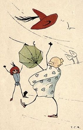 | But Fate at last to them was kind: It sent a Roaring, Raging Wind! Which, Just as Sam was passing by, Blew off Selina's Hat! Oh! My! |