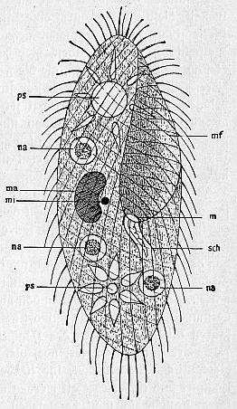 Abb. 2. Pantoffeltierchen. Sehr stark vergrößert. mf Mundfeld, m Mund, sch Schlund, na Nahrungsballen, ps pulsierendes Bläschen (Vakuole) ma Großkern, mi Kleinkern. Rings um den Protoplasmaleib herum sieht man die Wimperhärchen, mit denen die Zelle im Wasser schlägt und sich fortbewegt. Aus Stridde.