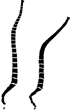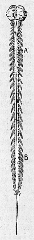 Abb. 34. Rückenmark, aus dem Wirbelkanal herauspräpariert. Von hinten. Man sieht bei A die Armanschwellung, die Stelle, wo die vielen großen Nervenzellen liegen, welche die Muskeln des Armes regieren. Bei B die Lendenanschwellung mit den Nervenzellen für die Beinmuskeln. Nach Toldt.