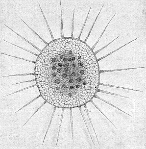 Abb. 4. Orbitolites. Einzelliges Lebewesen, das im roten Meer lebt. Aus der mit Poren versehenen Kalkschale, die die Zelle umgibt, sieht man die Scheinfüßchen herausragen. Schwach vergrößert. Nach Verworn.
