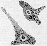 Wie bei Menschen, so sieht man auch bei Tieren mit zunehmendem Alter die Fett- und Pigmentkörnchen sich in den Nervenzellen häufen. Mühlmann hat die Nervenzellen vom Meerschweinchen, von der Kuh, der Maus, dem Papagei u. a. auf ihren Gehalt an Fett- und Pigmentkörnchen untersucht. Stets waren sie vorhanden, wie uns die Abb. 28 u. 29 für die Kuh und für die Maus zeigen. Sehr schön ist der Unterschied zwischen der jugendlichen und gealterten Nervenzelle auf den Abb. 30 u. 31 zu sehen: die Fettkörnchen fehlen bei dem neugeborenen Meerschweinchen, während sie bei dem 2 1/2 Jahre alten Meerschweinchen in beträchtlicher Zahl vorhanden sind. Ebenso beim jüngern und ältern Papagei (Abb. 32 u. 33). Zuweilen findet man die Pigmentkörnchen auch in dem Kern der Zelle liegen (Abb. 28).