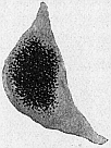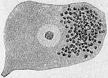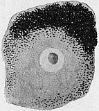 [67]Im höheren Alter liegen die nunmehr ganz dunklen Pigmentkörnchen in dichten Haufen beisammen, wie uns die Abb. 26 zeigt, die uns eine Nervenzelle einer 80jährigen Frau vor Augen führt. Man kann hier die einzelnen Pigmentkörnchen gar nicht mehr zählen, so groß ist die Zahl der dicht beisammen liegenden Körnchen. Manchmal nehmen bei alten Leuten die Pigmentkörnchen beinahe die ganze Zelle ein, so daß nur ein schmaler Saum von Protoplasma in der Zelle von ihnen frei bleibt (Abb. 27).