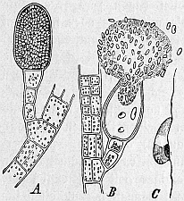 Die Fortpflanzungszellen bei vielen Algen sind sogenannte Schwärmsporen, sehr kleine Zellen, die mit einer oder mehreren Rudergeißeln versehen sind. Die Schwärmsporen entstehen durch Teilung aus einer Mutterzelle, die sich statt in zwei in zahlreiche Zellen aufgeteilt hat (Abb. 35 A). Diese Zellen sind natürlich viel kleiner als die Zellen sonst. Die ganze Schar der kleinen Tochterzellen oder Schwärmsporen bleibt zunächst noch beisammen innerhalb der Zellwände der Mutterzelle, gleichsam in einem Bläschen (A). Dann platzt das Bläschen eines schönen Tages auf (B), die kleinen Zellen werden frei und schwärmen ins Wasser hinaus (C). Eben darum hat man sie Schwärmsporen genannt. Nach einiger Zeit setzen sich die Schwärmsporen auf einer Unterlage fest, wachsen heran, teilen sich und bilden schließlich eine junge Zellkolonie, einen neuen Algenstock. Bei manchen Algen kommt es vor, daß zwei Schwärmsporen, die äußerlich einander völlig gleichen, sich miteinander vereinigen, und zu einer Zelle verschmelzen. So, wie das bei der Kopulation der Einzelligen, wo die Zellen allerdings später wieder auseinander gehen, der Fall ist. Zunächst sind, wie gesagt, alle Schwärmsporen noch einander gleich. Aber eine Braunalge hat da schon einen Schritt zur Befruchtung gemacht: von den Schwärmsporen, die alle noch gleich aussehen, setzen sich manche schon frühzeitig auf einer Unterlage fest und werden von den andern beweglichen Schwärmsporen umschwärmt wie die Eizelle von den Samenzellen (Abb. 36,1), bis sich schließlich eine freibewegliche Schwärmspore mit einer festsitzenden vereinigt hat, mit ihr verschmolzen ist (5). Die festsitzende Schwärmspore ist das Urbild der weiblichen Eizelle, die bewegliche Schwärmspore das Urbild der männlichen Samenzelle. Bei einer andern Braunalge gibt es zweierlei Schwärmsporen, die schon äußerlich zu unterscheiden sind: große und kleine Schwärmsporen. Die großen[85] setzen sich nach kurzem Schwärmen bald fest und werden von den kleinen umschwärmt. Bei einer dritten Braunalge sind die großen Schwärmsporen von vornherein unbeweglich. Sie sind hier schon richtige unbewegliche Eizellen, und die kleinen freibeweglichen Schwärmsporen sind richtige Samenzellen. So lassen sich schon innerhalb dieser einen Gruppe von Algen die Beziehungen der geschlechtlichen Fortpflanzung zur Kopulation in ziemlich lückenloser Weise aufzeigen.