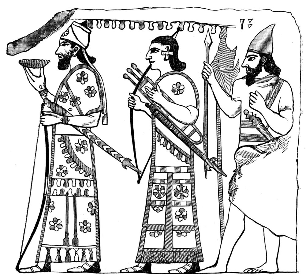 The Assyrian paintings have a broad outline which is of a lighter color than the rest of the picture; it is generally white or yellow. There are very few colors used in them. This does not accord with our notions of the dresses and stuffs of the Assyrians, for we suppose that they were rich and varied in color—probably they had so few pigments that they could not represent in their paintings all the colors they knew.