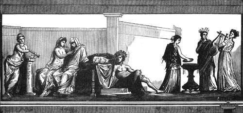 The Etruscan tombs which have been opened contain many beautiful objects of various kinds, and were frequently decorated with mural pictures. They often consist of several rooms, and have the appearance of being prepared as a home for the living rather than for the dead. I shall give you no long or wordy description of them; because if what I tell you leads you to wish to know more about them, there are many excellent books describing them which you can read. So I will simply give you two cuts from these Etruscan paintings, and tell you about them.
