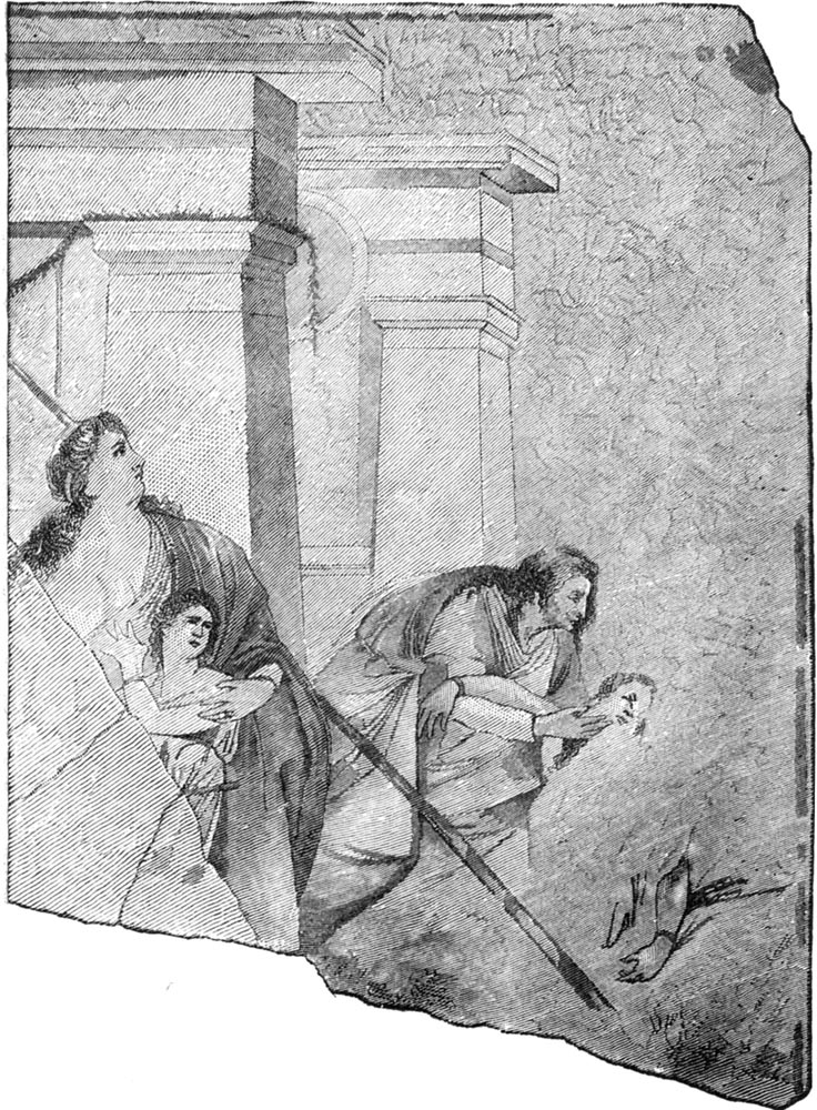 However, both these artists were surpassed by Timanthes, according to the ancient writers, who relate that he engaged in a trial of skill with Parrhasius, and came off the victor in it. The fame of his picture of the “Sacrifice of Iphigenia” was very great, and its one excellence seems to have been in the varied expression of its faces. The descriptions of this great work lead to the belief that this Pompeian wall-painting, from which we give a cut, closely resembles that of Timanthes, which no longer exists.