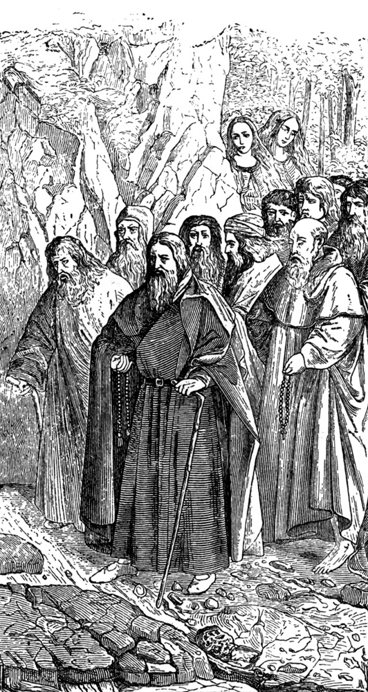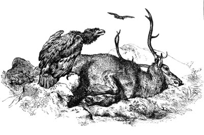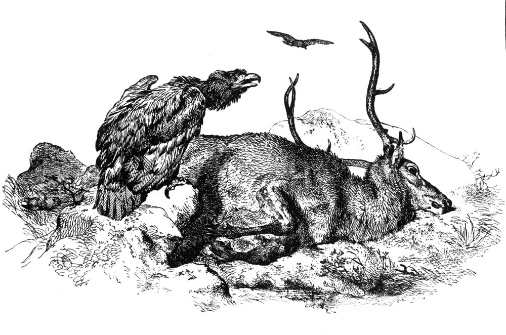 In 1826 Landseer painted “Chevy Chase;” it was the only[Pg 298] historical painting he ever did, and still remains at Woburn Abbey, where it originally went. The animals in the picture are excellent of course, but this sort of painting was not that in which Landseer showed his best. This year of 1826 was an important one to this master. He was twenty-four years old, and was immediately admitted an Associate of the Royal Academy. No one can be a candidate for this honor at a younger age, and very few others have attained it so early. Before he was thirty Landseer was a full member, and his diploma picture, “The Dead Warrior” is in the Royal Academy. But this year saw a great change in his pictures, as may be seen in that of “The Chief’s Return from Deer-stalking,” which he sent to the next exhibition. It was free, broad, and effective beyond any previous work, and this manner was his best. Many judges fix the year 1834 as the very prime in the art of Landseer, and one of the works of that year, called “Bolton Abbey in the Olden Time,” is very famous. It represents the vassals of the abbey bringing in their tributes of game, fish, and fruits, which the jolly, old monks gladly receive.