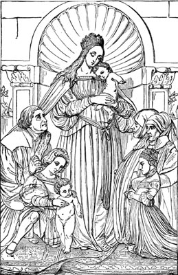 Sir Godfrey Kneller (1646-1723), born at Lübeck, was a rival to Sir Peter Lely, and had the honor of painting the portraits of eight crowned heads and a very great number of other people of importance. He had studied both the Dutch and Italian manner; for he was the pupil of Rembrandt and Bol, of Carlo Maratti and Bernini. Some critics praise his pictures very much, while others point out many defects in them. He painted very rapidly, and he sometimes hurried his pictures off for the sake of money; but his finished works are worthy of remark. He especially excelled in painting hair; his drawing was correct; some of his groups of children are fine pictures; and some[Pg 252] madonnas that he painted, using his sitters as models, are works of merit. His monument was made by Rysbrach, and was placed in Westminster Abbey.