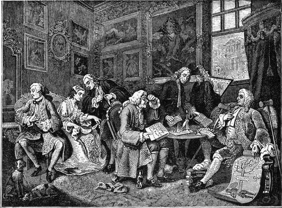Soon after this he began his series of pictures called the “Harlot’s Progress,” and when Sir James saw them he was so satisfied with the talent of Hogarth that he declared that such an artist could support a wife who had no dower, and the two painters were soon reconciled to each other. Before 1744 Hogarth had also painted the series of the “Rake’s Progress” and “Marriage à la Mode” (Fig. 71).