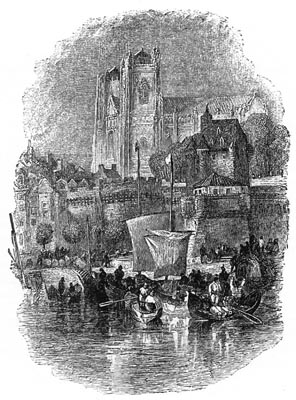 For three years Turner travelled in France, and made studies and sketches up and down its rivers. These were first published as “Turner’s Annual Tour,” but were afterward brought out by Bohn as “Liber Fluviorum.” These sketches have been highly praised by Ruskin; but Hammerton, who certainly knows French scenery far more accurately than Ruskin, while praising the exquisite beauty of Turner’s work, challenges its accuracy, and especially as to color, saying that “Turner, as a colorist, was splendid and powerful, but utterly unfaithful.” Leitch Ritchie, who was associated with Turner in this work, could not travel with him, their tastes were so unlike; and he says that Turner’s drawings were marvellously exaggerated, that he would make a splendid picture of a place without a single correct detail, trebling the height of spires and throwing in[Pg 287] imaginary accessories. Turner always claimed the right to change the groupings of his landscapes and architecture at will, preferring to give a general and idealized view of the landscape rather than a precise copy thereof.