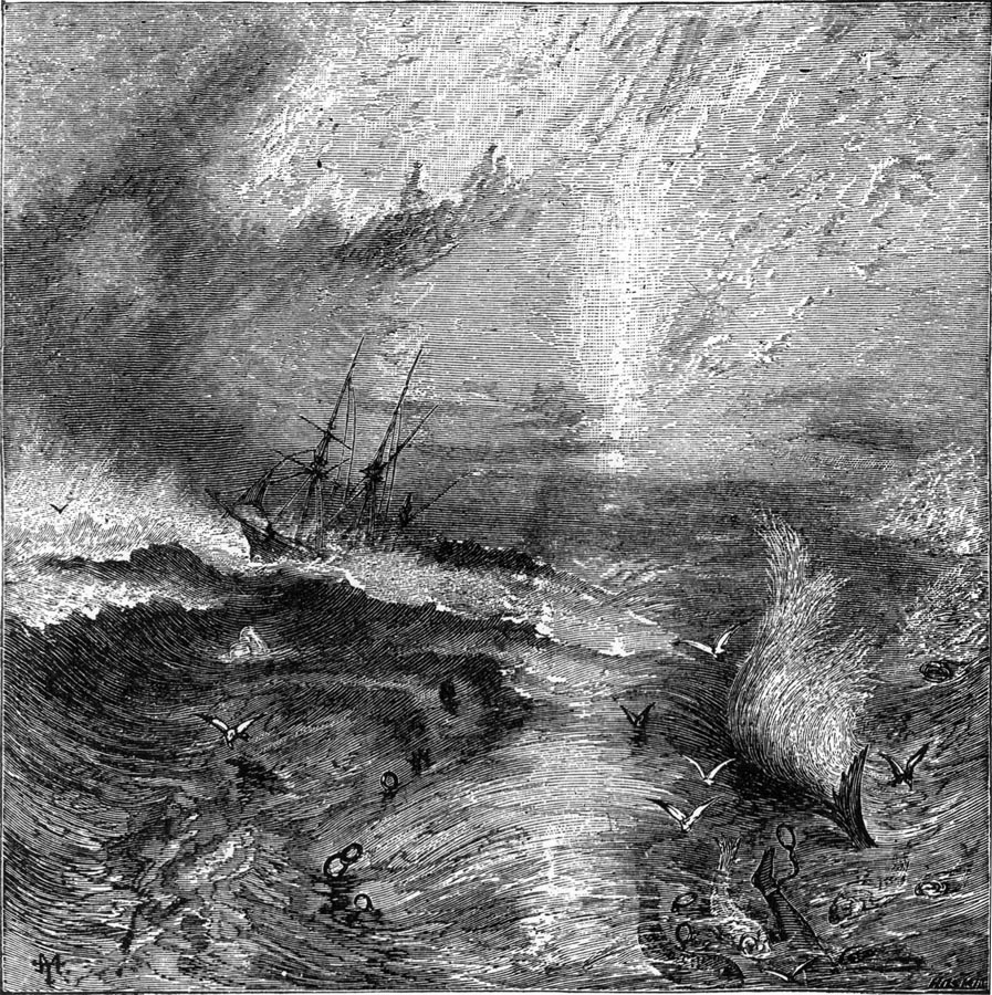 One of the most celebrated of Turner’s pictures was that of the “Old Téméraire,” an old and famous line-of-battle ship, which in the battle of Trafalgar ran in between and captured the French frigates Redoubtable and Fougueux. Turner saw the Téméraire in the Thames after she had [Pg 288]become old, and was condemned to be dismantled. The scene is laid at sunset, when the smouldering, red light is vividly reflected on the river, and contrasts with the quiet, gray and pearly tints about the low-hung moon. The majestic old ship looms up through these changing lights, bathed in splendor. The artist refused a large price for this picture by Mr. Lennox, of New York, and finally bequeathed it to the nation. In 1840 Turner exhibited the “Bacchus and Ariadne,” two marine scenes, and two views in Venice; also the well-known “Slavers Throwing Overboard the Dead and Dying, a Typhoon Coming On” (Fig. 76), which is now in the Museum of Fine Arts of Boston. Of this picture Thackeray says: “I don’t know whether it is sublime or ridiculous.” But Ruskin, in “Modern Painters,” says: “I believe if I were reduced to test Turner’s immortality upon any single work, I should choose the ‘Slave Ship.’ Its daring conception, ideal in the highest sense of the word, is based on the purest truth, and wrought out with the concentrated knowledge of a life. Its color is absolutely perfect, not one false or morbid hue in any part or line, and so modulated that every square inch of canvas is a perfect composition; its drawing as accurate as fearless; the ship buoyant, bending, and full of motion; its tones as true as they are wonderful; and the whole picture dedicated to the most sublime of subjects and impressions (completing thus the perfect system of all truth which we have shown to be formed by Turner’s works), the power, majesty, and deathfulness of the open, deep, illimitable sea.”