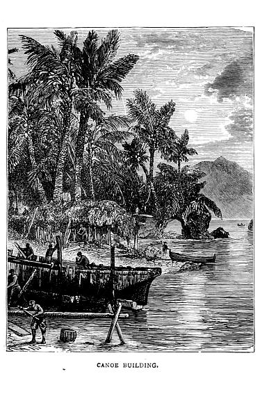 Their tools were few and rude: an adze of stone, a chisel or gouge of bone—generally that of a man’s arm between the wrist and elbow—a rasp of coral, and the sting of a sting-ray, with coral sand as a file or polisher. With these tools they built their houses and canoes, hewed stone, and felled, clove, carved, and polished timber. Their axes were of different sizes, but even with the largest it took them several days to cut down a tree. The canoes were often large, and constructed with great labour and ingenuity. They were of two builds: one, the Ivaha, for short excursions, was wall-sided, with a flat bottom; the other, the Pahie, for longer voyages, was bow-sided, with a sharp bottom. There was the fighting Ivaha, the fishing Ivaha, and the travelling Ivaha. The fighting Ivaha was the largest; the head and stern were raised sometimes seventeen feet or more above the sides, which were only three feet out of the water. Two of these vessels were always secured together by strong poles about three feet apart. Towards the head a platform was raised, about twelve feet long, wider than the boats, and on this platform stood the fighting men, armed with slings and spears; for they did not use their bows and arrows except for amusement. Below the stage the rowers sat with reserved men, who supplied the place of those that were wounded. Some of their war canoes had stages or decks from one end to the other. The fighting Pahie was often sixty feet long, and two were also joined together, with a large platform above them. One measured by Captain Cook was, though sixty feet long, only one foot and a half at the gunwale, with flat sides; then it abruptly widened out to three feet, and narrowed again to the keel. The double canoes were sometimes out a month together, going from island to island. Some carried one, some two masts, with sails of matting, of shoulder-of-mutton shape. The bottom of a large Pahie was formed of three or more trunks of trees secured together and hollowed out, above this flooring were the sides of plank, two inches thick, and about fifteen inches broad; and then there were the upper works, hollowed out of trunks of trees like the bottom. Sometimes these canoes were used singly, but then they were fitted with outriggers like the flying Proa of the Ladrone Islands. The outrigger is a log of wood fixed at the end of two poles, which lie across the vessel, projecting eight or ten feet, according to her size. The length and high sterns of these canoes gave them great advantage in putting off from the shore through the surf; they also sailed and paddled very fast. The amount of time and labour expended in the construction of one of these canoes must have been very great, and speaks well for the intelligence as well as for the industry and perseverance of the islanders.