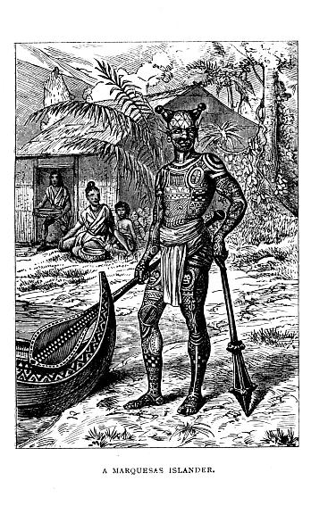 Contrary to the usual custom, the men wore their hair long or tied up in a bunch, while the women wore it cropped short round their ears. The bodies of both sexes were tattooed, but not their faces. They manufactured three sorts of cloth for dress. The finest and whitest was made from the paper-mulberry tree, and was used for the dresses of the chief people. The second, used by the common people, was made from the bread-fruit tree, and the third from a tree resembling a fig-tree. The latter was coarse and harsh, and of the colour of the darkest brown paper; but it was valuable because it resisted the wet, while the others did not. The women of the upper class wore three pieces of cloth; one, eleven yards long and two wide, was wrapped round the waist, and hung down like a petticoat; while the two others were formed like the South American poncho, the head being put through a hole in the middle, so as to leave the arms at liberty. The men dressed in much the same way, except that instead of allowing the cloth to hang down like a petticoat, they brought it between their legs so as to have some resemblance to breeches. The higher a person’s rank, the more clothes he wore, some throwing a large piece loosely over the shoulders. They shaded their eyes from the sun with hats made at the moment required, of cocoanut leaves or matting, and the women sometimes wore small turbans, or a head-dress which consisted of long plaited threads of human hair, wound round and round, with flowers of various kinds stuck between the folds, especially the Cape jessamine, which was always planted near their houses. The chiefs sometimes wore the tail feathers of birds stuck upright in their hair. Their personal ornaments besides flowers were few; but both sexes wore ear-rings of shells, stones, berries, or small pearls.