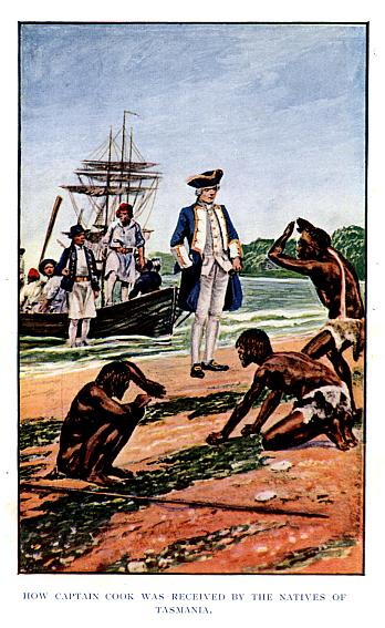 On the morning of the 30th a comet was seen in the east, a little above the horizon. Tupia, who observed it with others, instantly cried out that as soon as the people of Bolabola perceived it they would attack the inhabitants of Uhetea, who would have to fly to the mountains to save their lives. Meeting with a heavy sea and strong gales from the westward, on September 1 Captain Cook wore and stood to the northward. On the weather moderating he continued his course to the westward during the whole of September. Several seals were seen asleep on the surface of the water, and various birds were perceived, a sure indication that the ship was approaching land. On October 6 land was seen from the mast-head, bearing west by north. In the evening it could be seen from the deck. It was not till the evening of the next day that the voyagers got near enough to observe the nature of the country, when it appeared of great extent, with four or five ranges of hills rising one over the other, and beyond them a lofty chain of mountains. The general opinion was that they had found the Terra Australia incognita. A bay was seen, and smoke rising from the shore, but night coming on, they were obliged to stand off till daylight. The next day, on standing in again, some small but neat houses were seen, and a considerable number of people seated on the beach. Farther on was discovered a tolerably high and regular paling, enclosing the whole of the top of a hill. Some on board supposed it to be a park for deer, others an enclosure for oxen or sheep. In the afternoon the ship came to an anchor in a bay off the mouth of a river. The sides of the bay were white cliffs of great height; the middle was low land, with hills rising behind and terminating in a chain of lofty mountains.