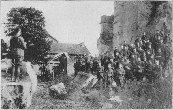 In the chill of that bleak November evening we crossed the German frontier and entered Gorz. Aged and feeble men and women looked sadly at us from their doors. Children, whose pinched faces clearly showed the ravages of hunger, timidly followed our supply trucks up the deserted street.