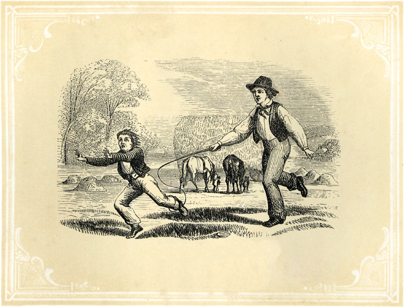 [125]But this was not the whole of the joke. Indeed, it was hardly the richest part of it. Mr. Marble, who saw what was going on, stood ready with his cart whip; and when Billy made his appearance, with a regiment of bumble-bees about his ears, he commenced beating him with the whip. Away ran the boy, and Mr. Marble chased him some half a dozen rods, and gave him about as many blows with the cart whip.