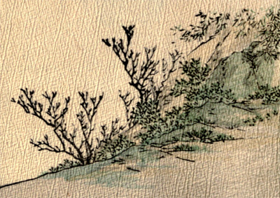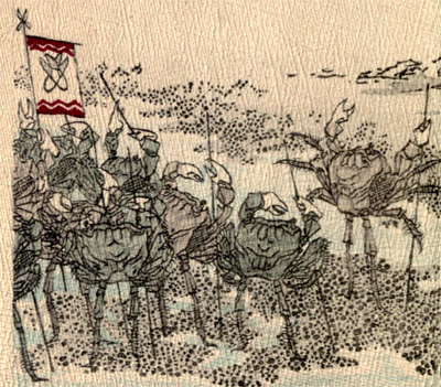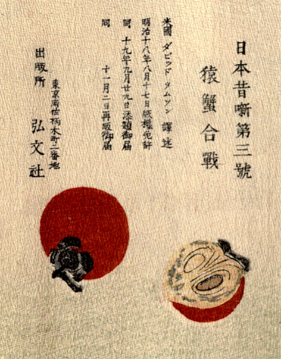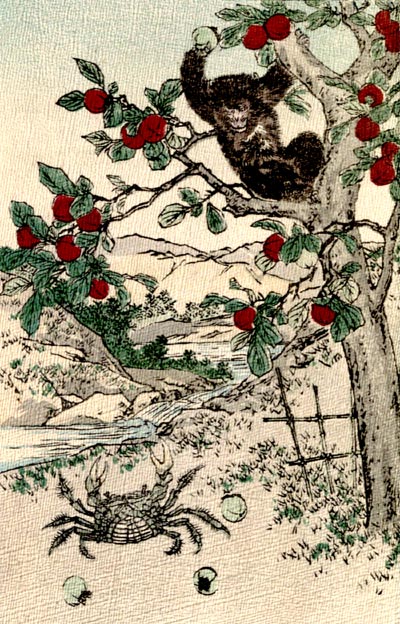 The monkey had picked up a persimmon-seed, and the crab had a piece of toasted rice-cake. The monkey seeing this, and wishing to get something that could be turned to good account at once, said: "Pray, exchange that rice-cake for this persimmon-seed." The crab, without a word, gave up his cake, and took the persimmon-seed and planted it. At once it sprung up, and soon became a tree so high one had to look up at it. The tree was full of persimmons but the crab had no means of climbing the tree. So he asked the monkey to climb up and get the persimmons for him. The monkey got up on a limb of the tree and began to eat the persimmons. The unripe persimmons he threw at the crab, but all the ripe and good ones he put in his pouch. The crab under the tree thus got his shell badly bruised and only by good luck escaped into his hole, where he lay distressed with pain and not able to get up. Now when the relatives and household of the crab heard how matters stood they were surprised and angry, and declared war and attacked the monkey, who leading forth a numerous following bid defiance to the other party. The crabs, finding themselves unable to meet and cope with this force, became still more exasperated and enraged, and retreated into their hole, and held a council of war.