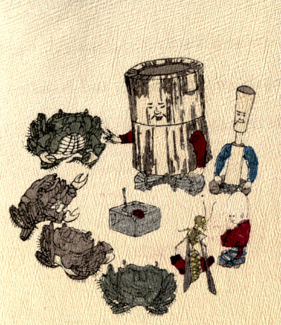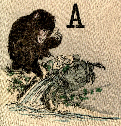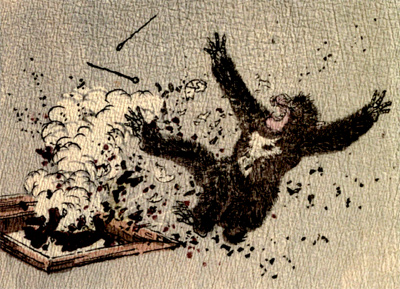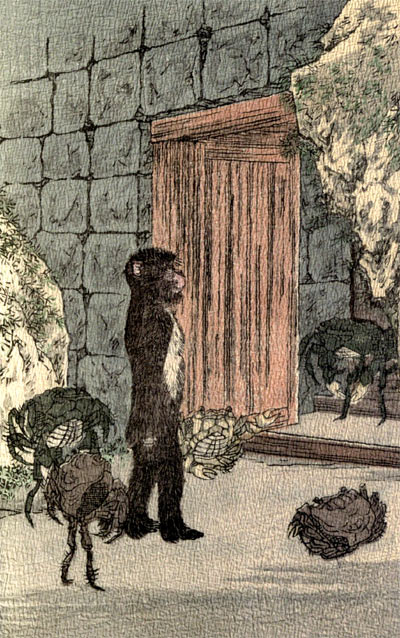 First, they requested that peace be made with the crabs; and thus they induced the king of the monkeys to enter their hole unattended, and seated him on the hearth. The monkey not suspecting any plot, took the hibashi, or poker, to stir up the slumbering fire, when bang! went the egg, which was lying hidden in the ashes, and burned the monkey's arm. Surprised and alarmed he plunged his arm into the pickle-tub in the kitchen to relieve the pain of the burn. Then the bee which was hidden near the tub stung him sharply in his face already wet with tears.