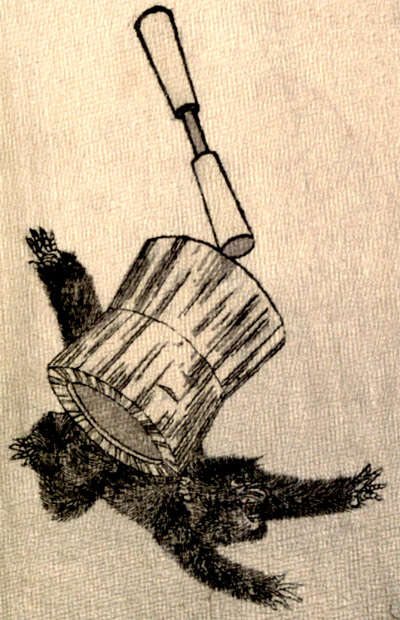 Without waiting to brush off the bee and howling bitterly, he rushed for the back door: but just then some sea-weed entangled his legs and made him slip. Then, down came the pounder tumbling on him from a shelf, and the mortar too came rolling down on him from the roof of the porch, and broke his back and so weakened him that he was unable to rise up. Then out came the crabs in a crowd and brandishing on high their pinchers they pinched the monkey to pieces.