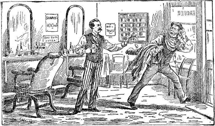 He jumped to his feet, declaring that he would not allow any man to come such a game on him,[Pg 658] and that he'd never pay fifteen cents for a shave. He left the shop in high dudgeon, and the barber declared I'd ruin the business in less than ten days.