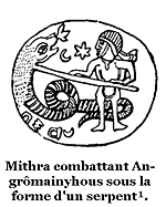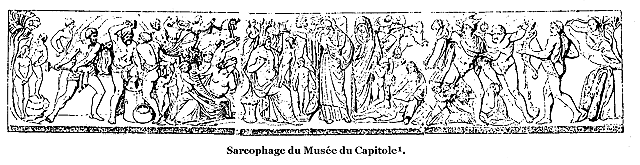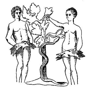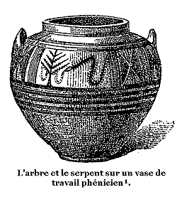 Note 8: (retour) La gravure placée en tête de ce chapitre, représente la scène de la tentation des premiers humains au jardin de 'Eden, d'après une peinture chrétienne des catacombes de Rome, empruntée au grand ouvrage de Perret.