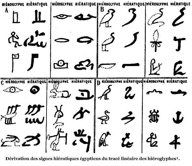 Les lettres de l'écriture égyptienne sont des figures hiéroglyphiques, au tracé plus ou moins altéré dans les tachygraphies successives de l'hiératique et du démotique, dont la valeur alphabétique a été établie en vertu du système acrologique. Chacune de ces figures représente la consonne ou la voyelle initiale de la prononciation de sa signification première d'idéogramme, soit figuratif, soit tropique, mais principalement du mot auquel, prise dans le sens figuratif, elle correspondait dans la langue parlée. Ainsi, parmi les phonétiques de l'usage le plus constant, nous voyons le son vocal vague flottant entre a et o, représenté par un «roseau,» dont le nom s'est conservé en copte sous la forme ake ou oke, ou par un «aigle,» ahom; l'articulation m par une «chouette,» mouladj; r par une «bouche,» rô; 'h par une «corde» tressée, 'haghe; kh par un «crible,» khai; sch par un «réservoir,» schêi, ou par un «jardin» de papyrus, schnê.