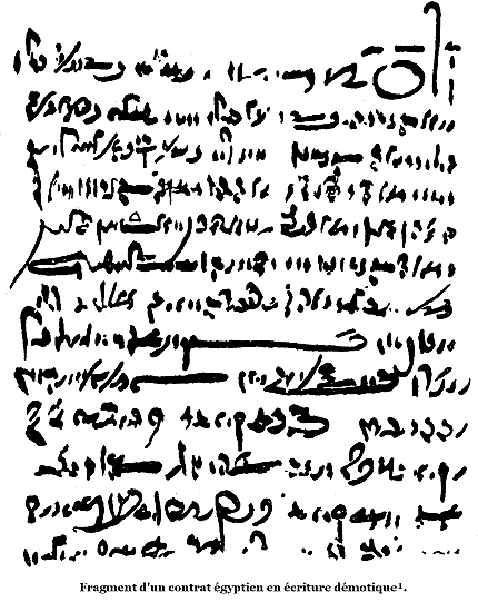 1M. Eugène Révillout, qui s'est occupé tout spécialement et avec tant de succès du déchiffrement des textes démotiques, et qui a fait faire les plus grands progrès à cette branche de la science, a bien voulu me donner la traduction suivante de ce début de contrat, daté du règne de Ptolémée Évergète II, qui donnera au lecteur un spécimen de la dernière tachygraphie de l'écriture égyptienne:«L'an 44, au mois de choïak, sous le roi Ptolémée, dieu Évergète, fils de Ptolémée, et la reine Cléopâtre, sa femme, les dieux Évergètes, du temps de N, prêtre d'Alexandre, des dieux Soters, des dieux Adelphes, des dieux Évergètes, des dieux Philopators, du dieu Philométor, du dieu Eupator, des dieux Évergètes, et du temps de N, canéphore d'Arsinoé Philadelphe, selon ce qui est établi à Alexandrie (Rakoti) et à Ptolémaïs (Psoï) en Thébaïde, le receveur Chapochrat, fils de Hor, dont la mère est Chachpéri, dit à Héraclios, fils de Memnon:
