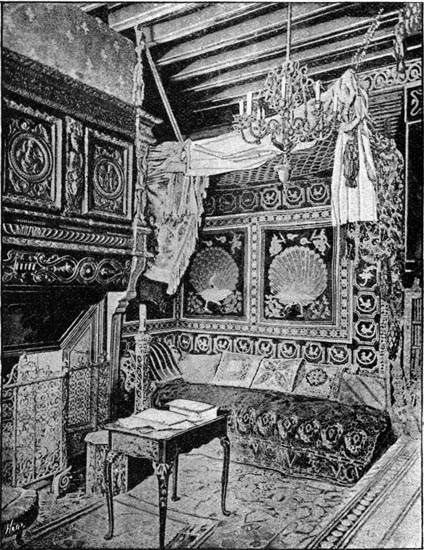 High up in the wall opposite the door is a deep and dark hole which I presume to be a window. On the floor, in addition to the slender furniture noticed by the light of the candle, I vaguely distinguish the outlines of my travelling trunk and of a water-jug. The cold humid air gives off a musty odour. Silence reigns, but, as I move, the sound of my footsteps echoes and re-echoes beneath the vaulted roof of the corridor.