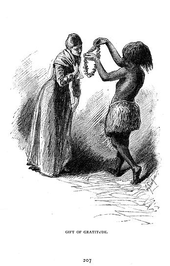 But whatever, at the moment, may be her reflections or feelings, ingratitude is not among them. Having learned that Leoline is the sister of one of the youths who so gallantly espoused the cause of her companions and herself in a far-off foreign land, she takes from her neck a string of the much-prized violet shells, and hangs it around that of the white girl, saying, “For what your brother did at Portsmouth.”