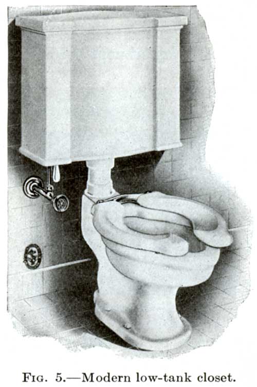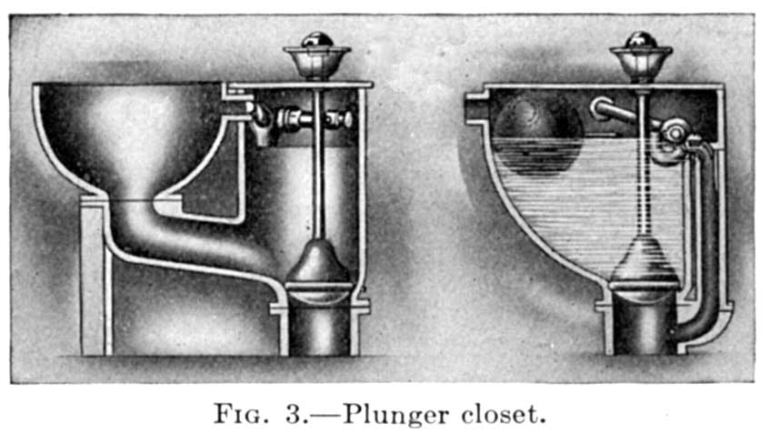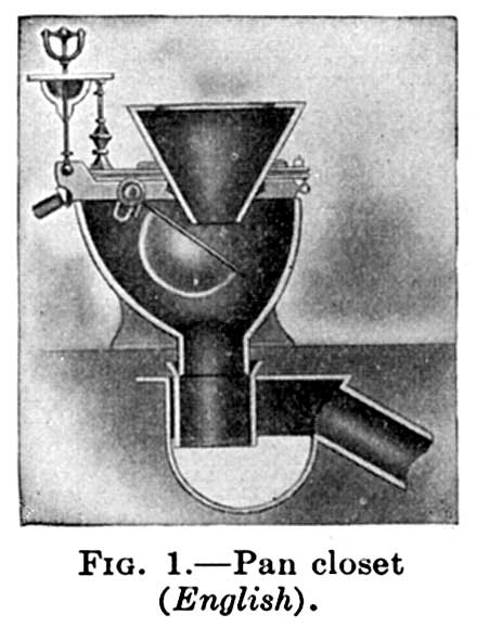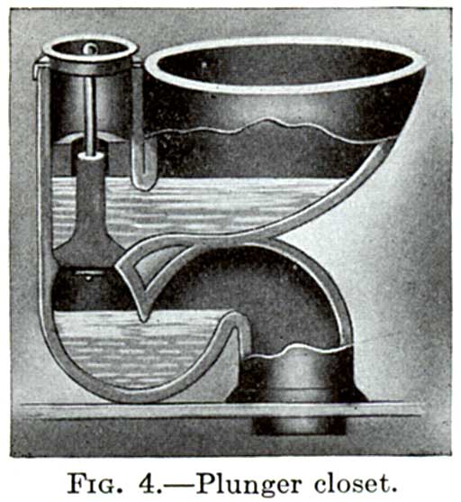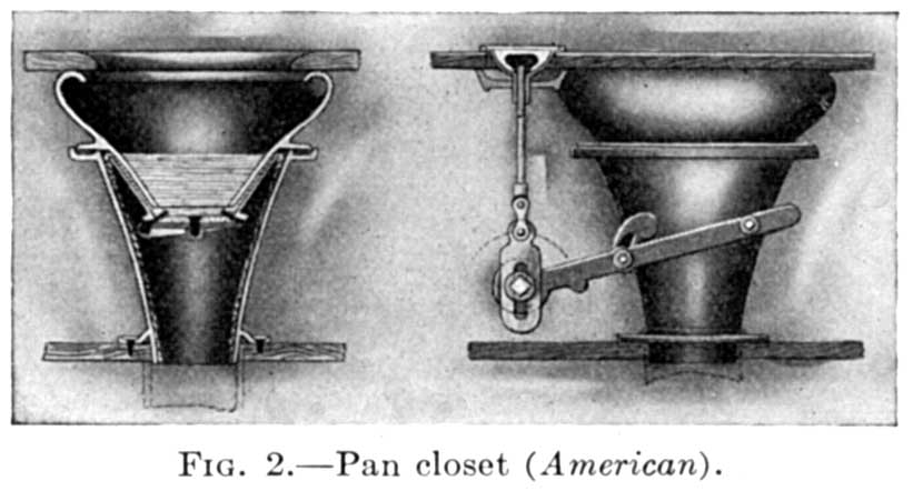 The development of sanitary earthenware illustrates how the above problems were satisfactorily solved. In the city of London a law compelling the use of drains was enforced, and in the early 70's the effect of this law was felt in this country. The introduction at this time of the mechanical water closet, known as the "pan closet," and the English plumbing material which was brought to this country[4] was the beginning of "American plumbing," which today outstrips that of any other country in the world. The "pan closet" continued in use for some time until the "valve closet" was introduced as a more sanitary fixture. Closely following these closets, in 1880, the plunger closet became popular as a still more sanitary fixture. The plunger closet continued in use until the present all-earthenware closet bowl drove all other makes from the market. The American development of the earthenware closet bowl put the American sanitary fixture far ahead of the English improvements, as the American earthenware is superior and the sanitary features of the bowls are nearer perfection.