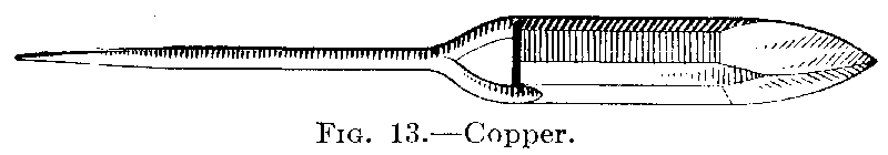 The Soldering Iron.—The soldering iron is one of the first tools a plumber has to master. This tool is sometimes called a "copper bit" as it is made of copper; and so throughout this book the words "soldering iron," "copper bit," "iron," and "bit" are used synonymously. There are several different-shaped irons in common use today, but an iron shaped like the one in Fig. 13 is the one for use in the following work. Take the iron as it is purchased, having a wooden handle and the copper exposed on pointed end. Before it can be used the point must be faced and tinned. To do this, proceed as follows: