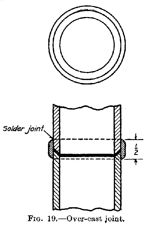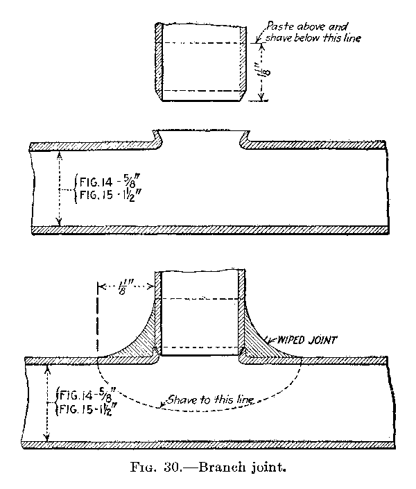 Cup Joint.—The materials necessary for the work (Fig. 15): 12 inches of 1⁄2-inch AA lead pipe, paste, rosin, 1⁄2 and 1⁄2 solder.