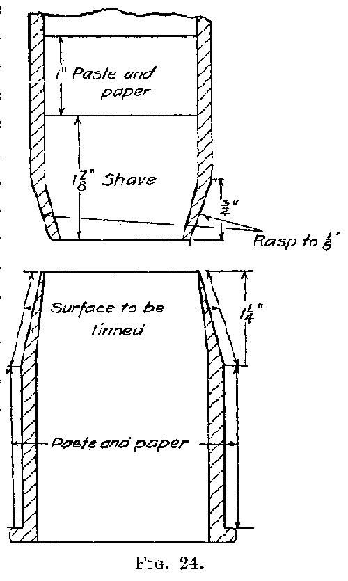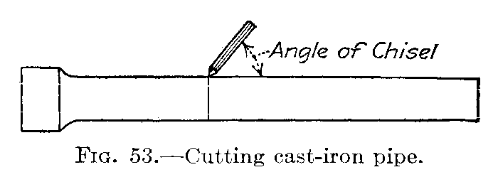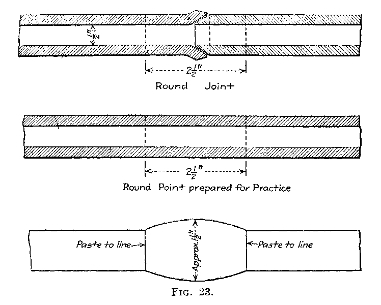 Sixth, take the other 6-inch piece of pipe and with the[16] turn pin spread one end of it. The turn pin must be struck squarely in the center with the hammer, the point of the turn pin being kept in the center of the pipe. The pipe should be turned after each blow of the hammer. The pipe must not rest on the bench but should be held in the hand while using the turn pin. If the pipe bends, it can be straightened with bending irons. If the pipe is spread more on one side than the other, the turn pin should be hit on the opposite side so as to even the spread.