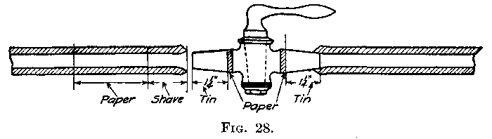 Rosin.—Rosin is purchased by the pound and comes in[13] chunks. It is very brittle and powders easily. Plumbers generally take a piece of 11⁄4 N. P. brass tubing, solder a trap screw in one end and a cone-shaped piece of copper on the other. The point of the cone is left open. Rosin is put into this tube and is easily sprinkled on work when needed.