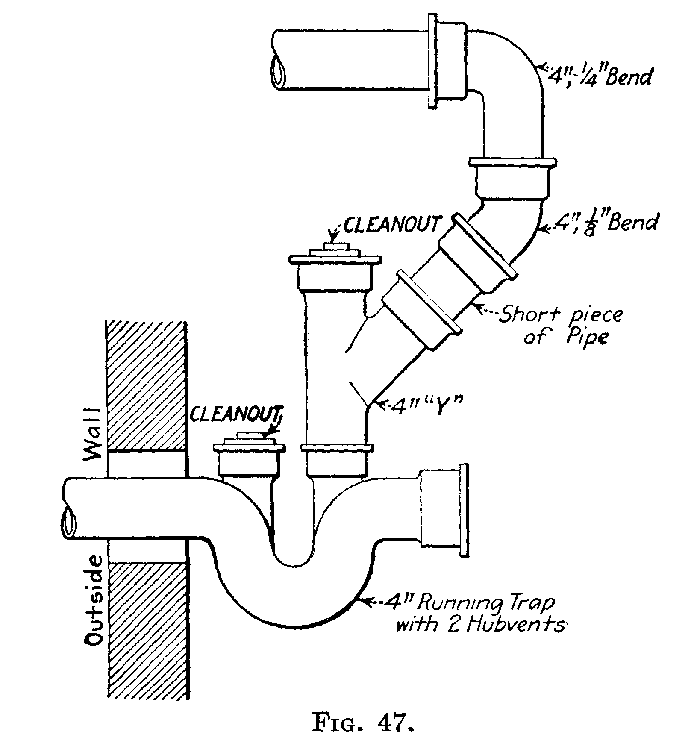 Sec. 17. Change in Direction.—All sewer, soil, and waste pipes must be as direct as possible. Changes in direction must be made with "Y"- or half "Y"-branches or one-eighth bends. Offsets in soil or waste pipes will not be permitted when they can be avoided, nor, in any case unless suitable provision is made to prevent the accumulation of rust or other obstruction. Offsets must be made with fourth degree bends or similar fittings. The use of T "Y"s (sanitary Ts) will be permitted on upright lines only.