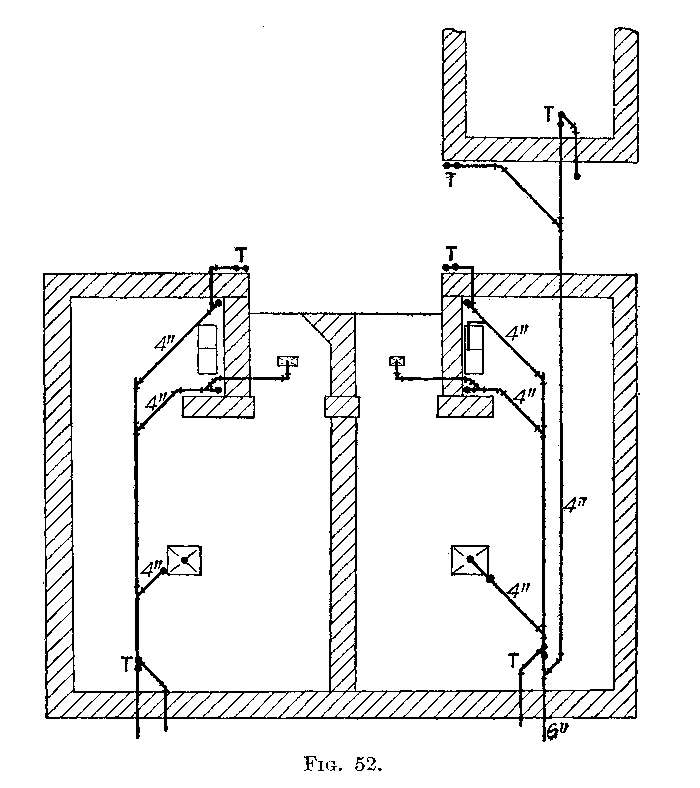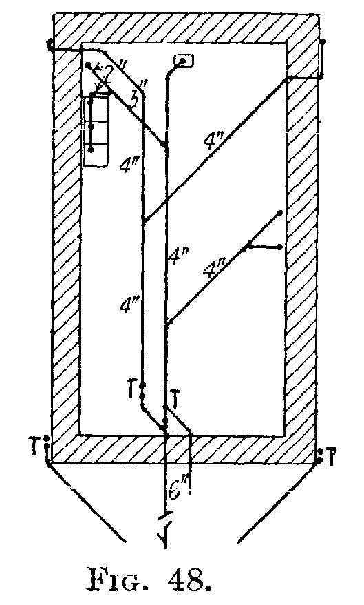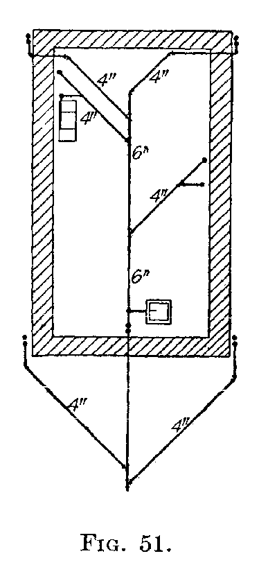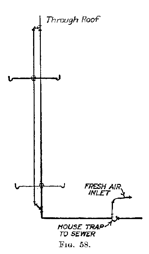 If the building is six (6) and less than twelve (12) stories in height, the diameter shall not be less than 5 inches. If more than twelve (12) it shall be 6 inches, in diameter. A building six (6) or more stories in height, with fixtures located below the sixth floor, soil pipe 4 inches in diameter will be allowed to extend through the roof provided the number of fixtures does not exceed[159] the number given in the table. All soil pipes must extend at least 2 feet above the highest window, and must not be reduced in size. Traps will not be permitted on main, vertical, soil or waste-pipe lines. Each house must have a separate line of soil and vent pipes. No soil or waste line shall be constructed on the outside of a building.