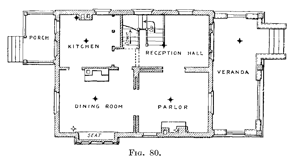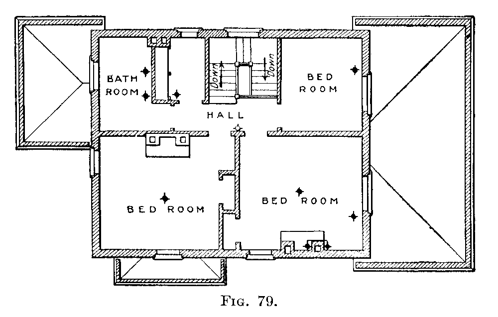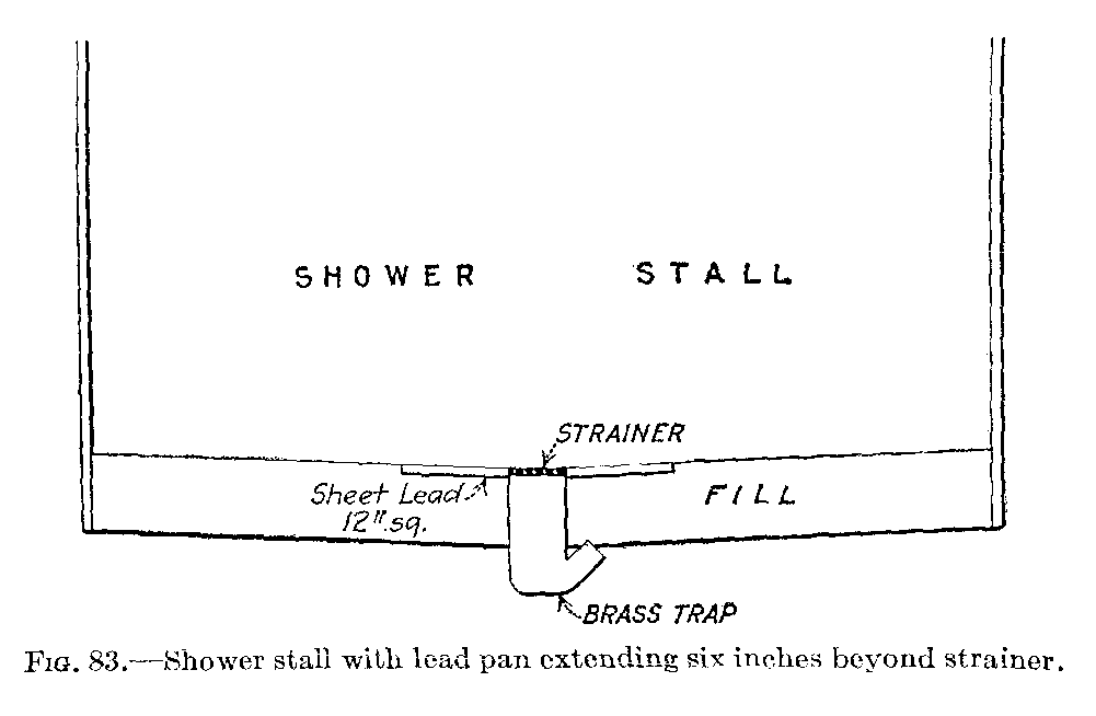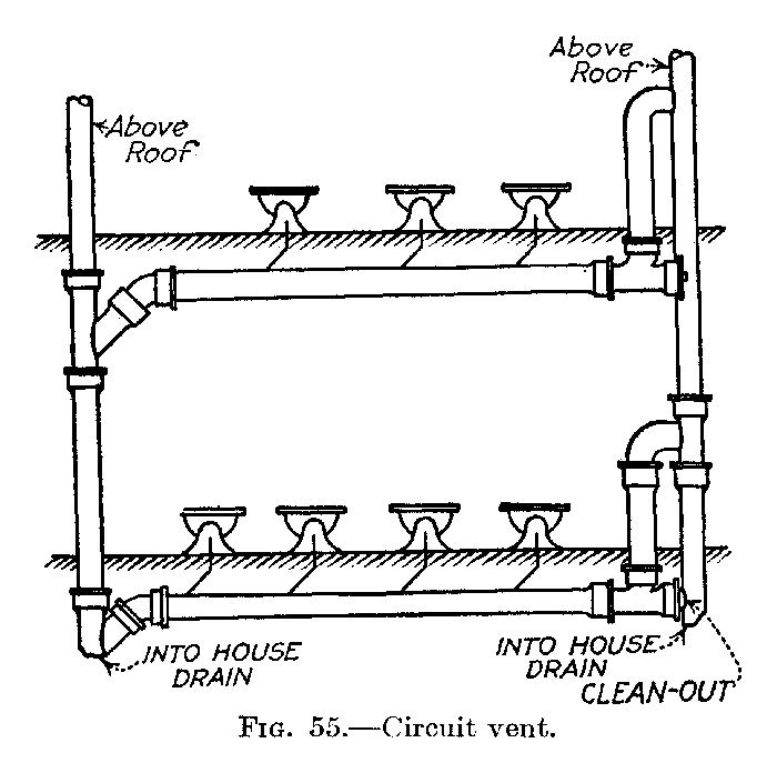 One of the first plumbing fixtures put into common use was a hollowed-out stone which served as a sink. It was with considerable interest that the writer saw a sink of this kind in actual use in the summer of 1915, at a house in a New England village. This sink had been in service for about 100 years. From this beginning the well-known fixtures of today have developed. The demand for moderate priced, sanitary closets, lavatories, and baths has led to the rapid improvement seen in plumbing fixtures. In the development of these fixtures, as soon as a bad feature was recognized the fixture was at once discarded, until now the market offers fixtures as mechanically fine as can be produced. Plumbing fixtures were at first manufactured so that it was necessary to support them on a wooden frame, and this frame was enclosed in wood. The enclosure made by this framework soon became foul and filthy and a breeding place for all kinds of disease germs and vermin. This bad feature was overcome by the introduction of open plumbing, that is, fixtures so made that the enclosure of wood could be done away with. The open plumbing allowed a free circulation of air around the fixture and exposed pipes, thereby making the outside of the fixture and its immediate surroundings free from all the bad features of the closed plumbing. Plenty of fresh air and plenty of[3] light are necessary for good sanitary plumbing.