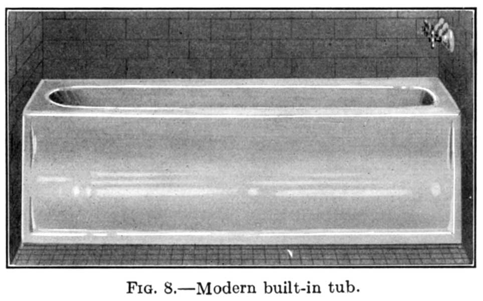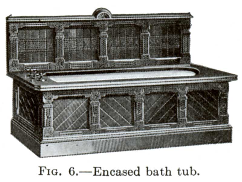 The first tubs used in this country were of wood lined with copper or zinc, and were built in or boxed in with wood panelling. The plumbing ordinances of today prohibit this boxing as it proved to be a breeding place for vermin, etc. As the illustration shows, the woodwork encasing the tub was in a great many cases beautifully carved and finished.