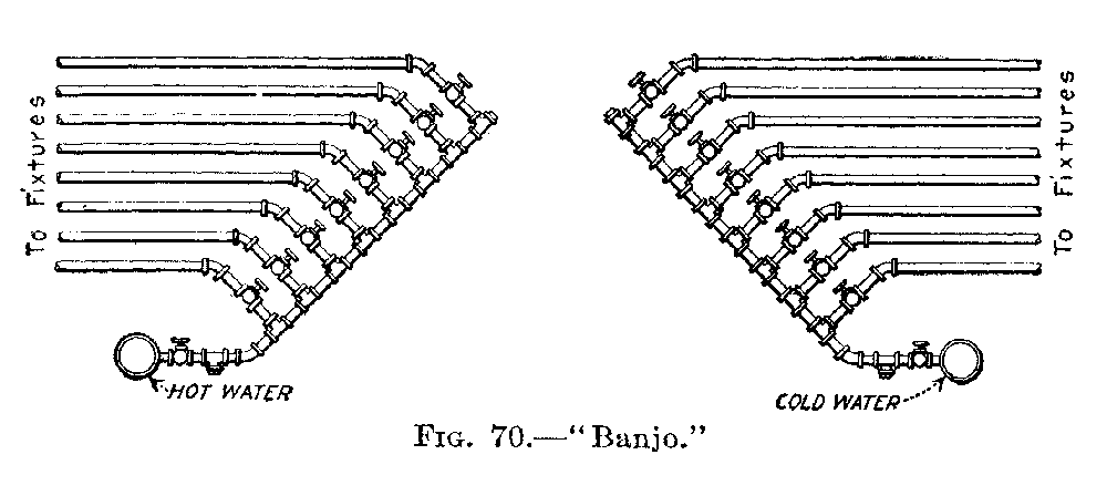 Modern plumbing as a trade is the arranging and running of pipes to supply pure water to buildings, the erecting of fixtures for the use of this supply, and the installing of other pipes for the resulting waste water. The work of the trade divides itself therefore into two parts: first the providing an adequate supply of water; and second, the disposing of this water after use. The first division offers few problems to the plumber, little variety in the layout being possible, and the result depending mostly upon the arrangement of the pipes and fittings; but the second division calls for careful study in the arrangement, good workmanship in the installing, and individual attention to each fixture.