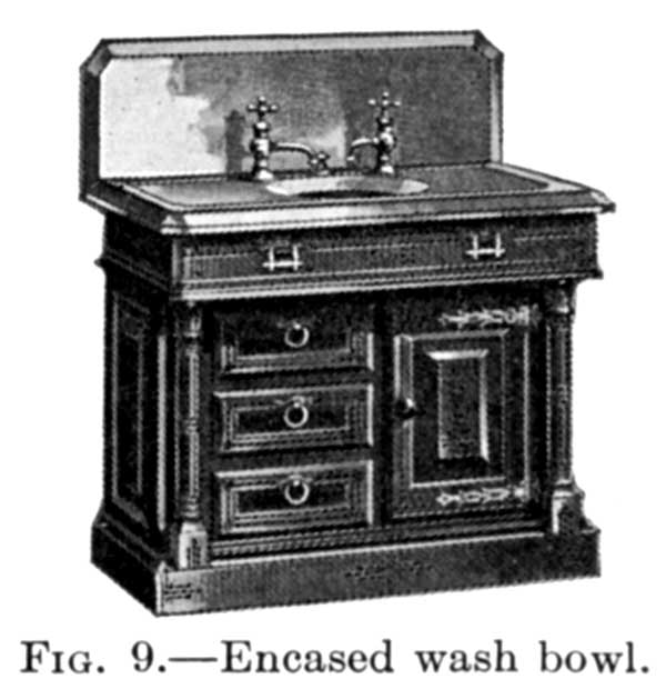 The Wash Bowl.—Succeeding the hand basin the first wash basins used in this country were made of marble or slate, with a round bowl of crockery. The bowl was 14 inches in diameter originally, but later was changed to an oval bowl. Like the bath tub these wash stands were[8] encased in wood, the encasing being used to support the marble top. Ornamental brackets were introduced and the wood encasement done away with.