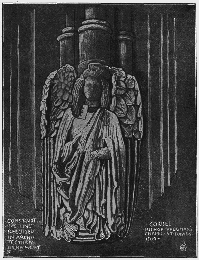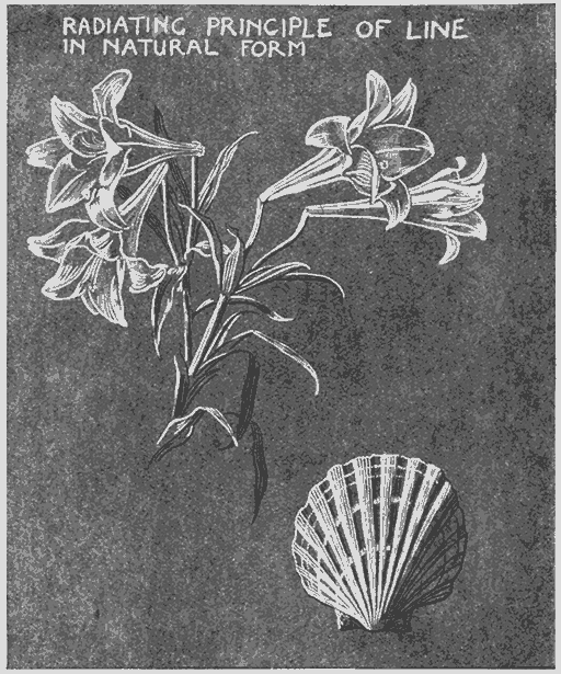 And when we leave plane surfaces and seek to invent appropriate, that is to say, expressive ornament allied to concave and convex surfaces, to the varied forms of pottery for instance, metal-work, and glass vessels, furniture, and accessories of all kinds, we shall find the same laws and principles hold good which should guide us in all design—to adapt design to the characteristics and conditions of the material, to its structural capacity, its use and purpose, as well as to use or invention in line, both as a controlling plan or base of ornament, as well as a means of the association and expression of form.