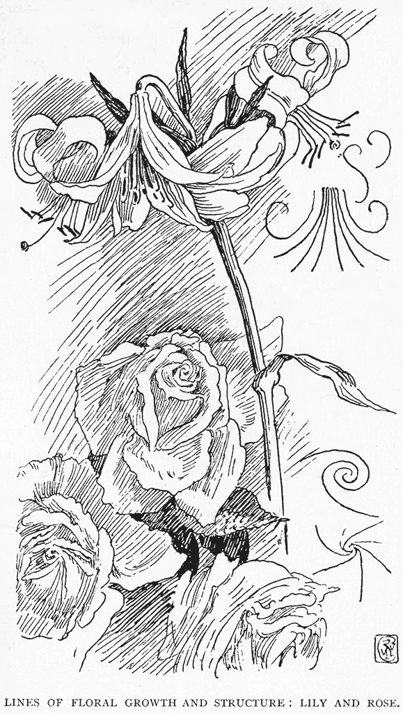 It is always a good practice in blocking in flowers, either from nature or as parts of a design, to leave a white outline at the junctions—that is to say, where one petal overlaps another, or where there is a joint in the stem, or a fold in the leaf—and to show the ribbings, markings, and divisions of flower and leaf.