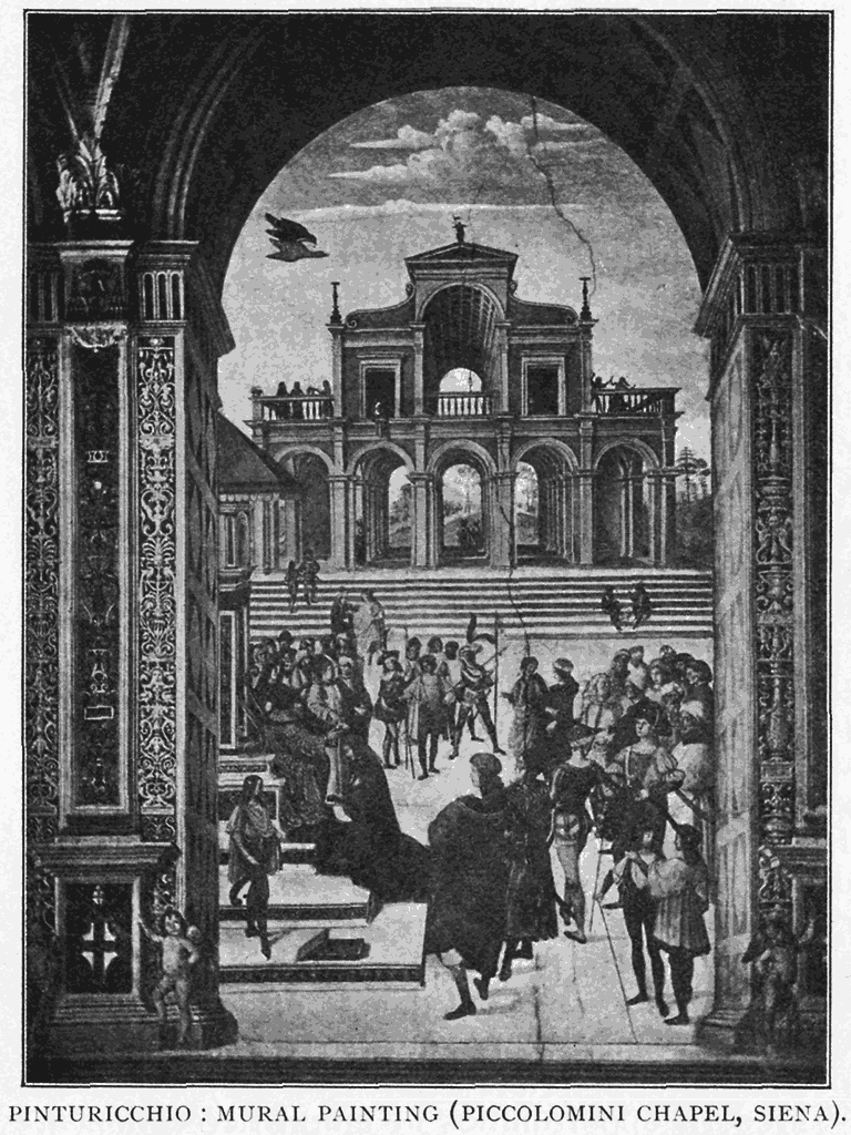 In Paul Veronese we find a cooler key of colour generally, with a fondness for compositions of figures with classical architecture, the rich patterned robes and varied heads contrasting pleasantly with the severe verticals and smooth surfaces of the marble columns—a sumptuous and dignified kind of picture-pattern, and fully adapted to the decoration of Venetian churches and palaces of the Renaissance.