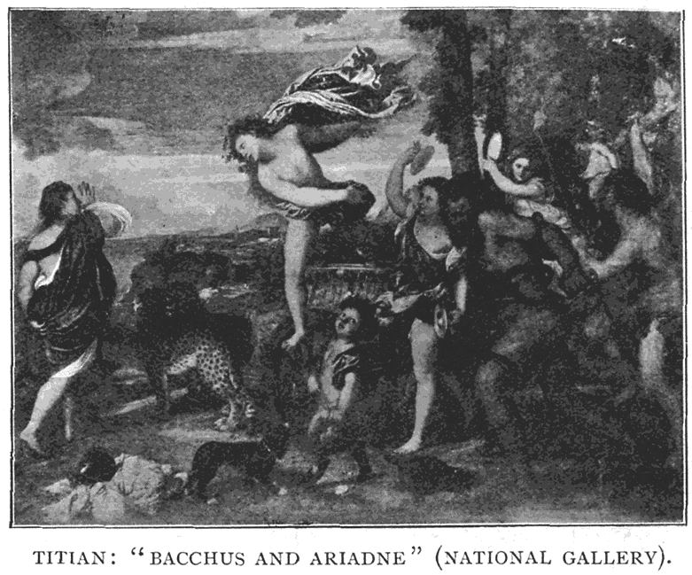 Titian's "Bacchus and Ariadne" is, perhaps, more what I have described as a pattern-picture, and is of a much later type. The full flush of colour and pagan joy of the Renaissance is here paramount, expressed with the masterly freedom of drawing and magnificent colour sense of the great [279]Venetian master. Yet, looking through the life, the movement, the swing and vitality of the figures, and the power and poetry by which the story is conveyed, we shall find a fine ornate design, sustaining an extremely rich and sumptuous pattern of colour. We have a spread of deep-toned blue sky barred with silvery white and gray clouds, great masses of brown and green foliage swaying against it, above a band of deep blue sea, and a field of rich golden brown earth. Warm flesh tones, deep and pale, break upon this with a gorgeous pattern of flying rose, blue, scarlet, orange, and white draperies, varied with the spotted coats of the leopards, the black of the dog, and the copper vessel and warm white of tumbled drapery.