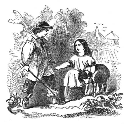 It was not long till Ann and Dash came to the turn of the lane, and then they both saw John, who sat upon the bank, very sad. The dog gave a bark, as if he had said, "There he is! I am glad we have found him!" Then Dash ran up to him as fast as he could, and John was very glad to see him come along the lane; and he said, "Good Dash! dear Dash! you are come to take me home."
