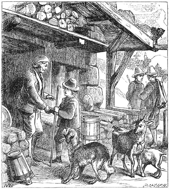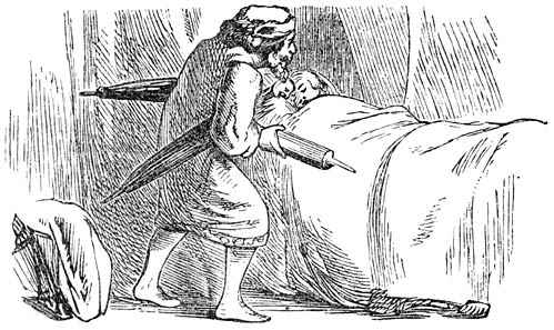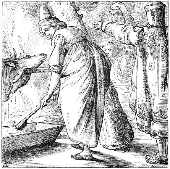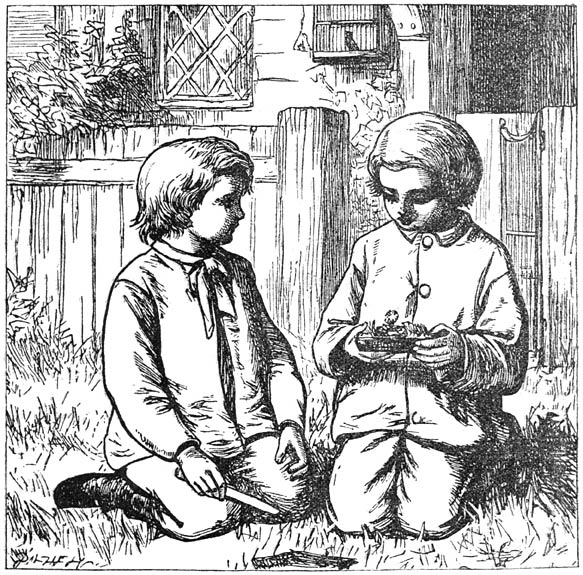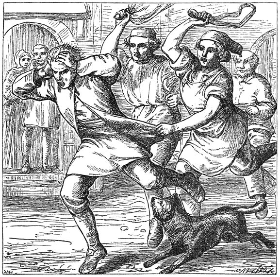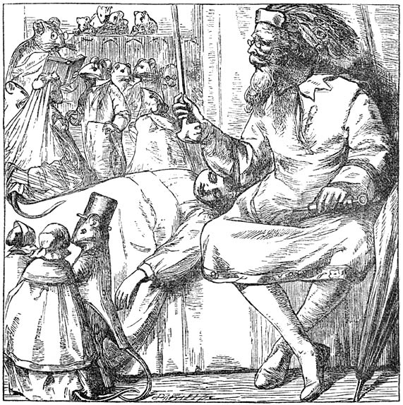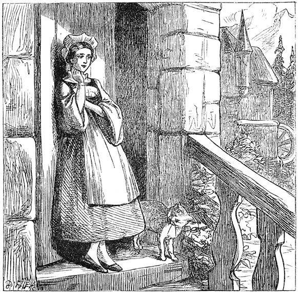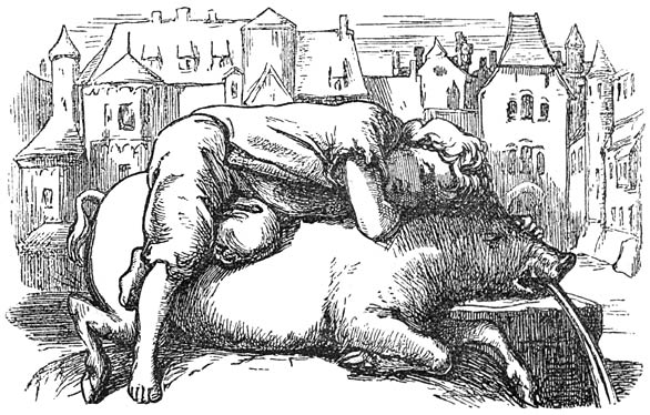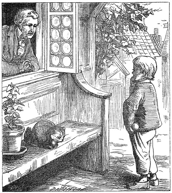 En zoo begaven zij zich naar de eendenkooi. Daarbinnen was een verschrikkelijk rumoer; want daar waren twee families, die elkaar het bezit van een palingkop betwistten, en eindelijk kreeg de kat dien toch.