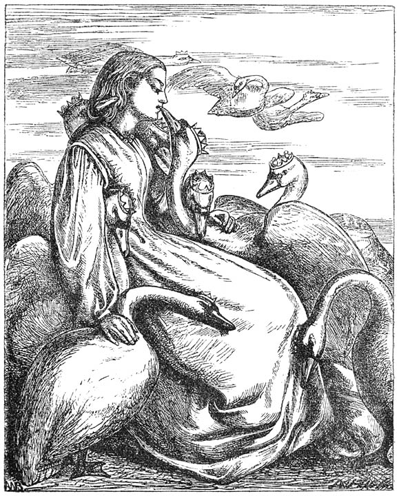 «Doodt mij maar!» zei het arme beest, boog zijn kop voorover en verwachtte niets anders dan den dood.—Maar wat zag het nu in het heldere water? Het zag daarin zijn eigen beeltenis, niet meer die van een loggen, grauwen, leelijken vogel, maar van een zwaan.
