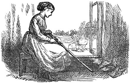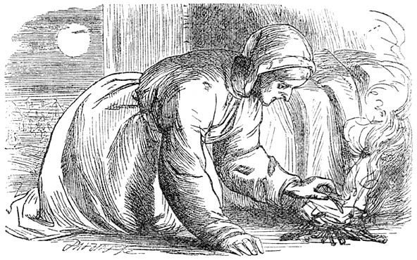 De kinderen wilden met hem spelen; maar het eendje dacht, dat zij hem kwaad wilden doen en vloog in zijn angst juist in het melkvat, zoodat de melk overal in de kamer rondspatte. De vrouw sloeg de handen in elkaar, waarop het eerst in het botervat en toen in de meelton vloog. Wat zag het er nu uit! De vrouw schreeuwde en sloeg met de tang naar het arme beest; de kinderen liepen elkaar omver, om het eendje te pakken; zij lachten en schreeuwden!—’t Was gelukkig, dat de deur openstond en dat het tusschen de takken in de versch gevallen sneeuw kon sluipen. Daar bleef het geheel uitgeput liggen.